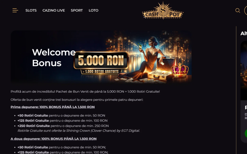 Oferta CashPot bonus pune la dispoziția utilizatorilor multiple promoții, concepute atât pentru cei noi, cât și pentru jucătorii activi. Pentru anumite jocuri, bonusurile pot include rotiri gratuite, bonusuri la depunere, cashback săptămânal sau oferte tematice. Fiecare bonus are reguli clare și bine explicate pentru ca utilizatorii să le înțeleagă. CashPot menține bonusurile actualizate în mod regulat. Aceste oferte sunt utile pentru jucătorii care doresc să exploreze jocuri noi și să-și extindă timpul de joc cu bani puțini.