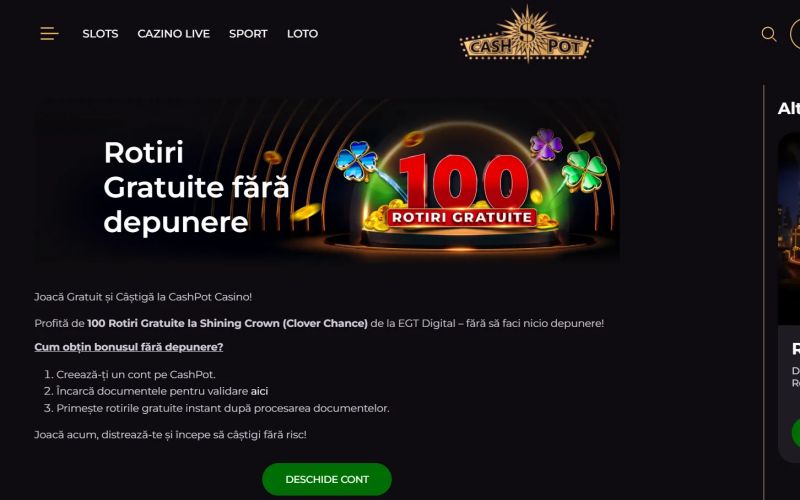 Bonusurile pot fi activate prin introducerea unui cod promo CashPot în secțiunea de oferte sau în momentul depunerii.