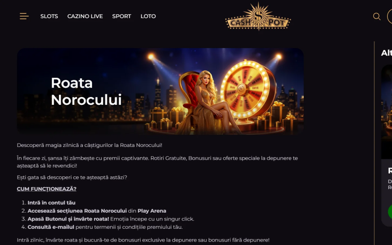 Rotirile gratuite sunt afișate în secțiunea bonusuri din contul CashPot RO, alături de termenii de utilizare.